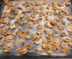 Backofen auf 175 Grad vorheizen. - Blech mit 15g Butter einschmieren und 200g Walnüsse darauf verteilen.