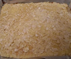 in der Zwischenzeit die Butter schmelzen, restlichen Zucker und gehobelte Mandeln mischen, alles auf dem vorgebackenen Teig verteilen und weitere 15 Min. backen