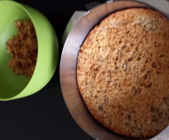 3. Runde Backform (26cm) leicht einfetten und den Teig gleichmäßig verteilen, Im vorgeheizten Backofen bei 175 Grad 30 Min. backen (Stäbchenprobe).