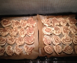 Zu einer Rolle aufrollen und dann in Schnecken scheniden. Dabei das Messer immer wieder befeuchten, sonst klebt die Sache zu sehr. Schnecken auf ein Blech legen.
