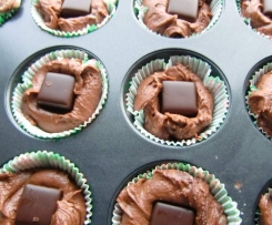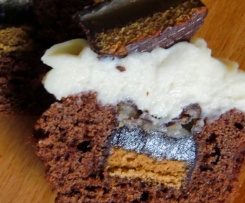 Zunächst heizt ihr den Backofen auf 180°C Ober-Unterhitze vor und legt ein Muffinblech mit 12 Vertiefungen mit Papierförmchen aus.Die Eier im Thermomix auf Stufe 4 etwa eine Minute rühren und dabei nach und nach den Zucker durch die Messbecheröffnung dazu geben. Die weiche Butter in kleinen Stückchen dazugeben und cremig schlagen Stufe 5/ 30 Sekunden. Mehl,Backpulver,Kakaopulver und Lebkuchengewürz dazuwiegen. Etwa 30 Sek. auf Stufe 4 verrühren und die Sahne durch die Messbecheröffnung zugießen. Den Teig mit einem Esslöffel auf die Förmchen aufteilen und in jeden Teig einen Dominostein drücken. Das Muffinblech in den vorgeheizten Backofen schieben und 30 Minuten bei oben genannten Einstellungen backen lassen, dann aus dem Ofen nehmen, kurz auskühlen lassen. Dann aus der Form heben und auf einem Rost vollständig auskühlen lassen.