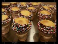 Den Teig in einen Gefrierbeutel füllen, unten eine Ecke abschneiden und die kleinen Becher bis max. zu 3/4 auffüllen. Im Ofen bei 180° ca. 17-19 Minuten backen (je nach Backofen). Wenn die Becher fertig sind sofort in Zuckerperlen wälzen, da die Schokolade am Becker noch weich ist. Ihr könnt sie auch nur mit Puderzucker bestäuben, mit Schoki bestreichen oder Zuckerguß mit Smartis - alles nach eurer Fantasie.