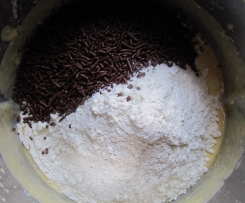 Mehl, Backpulver und Schokostreusel ebenfalls in den