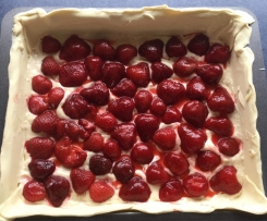 Die Quarkmasse auf dem Blätterteig verstreichen. Erdbeeren halbieren, mit der Schnittfläche nach unten darauf verteilen. (Habe gefrorene Erdbeeren auftauen lassen, da es noch keine schönen frischen gibt, geht auch)
