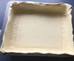 Blätterteig aufrollen, eine Backform (habe eine eckige genommen) /alternativ eine 26 cm Springform- damit auslegen, den überschüssigen Teig als Rand auslegen.