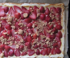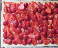 Das Rezept stammt aus einer Zeitschrift. Im Original wurde zum Bestreichen Sahne verwendet und für die Marzipanmasse Crème double. Außerdem wurden nur 400 g Erdbeeren genommen. Ich denke, dann schmeckt man das Marzipan mehr durch, aber wir mögen es auch gern fruchtig.
