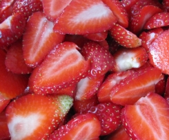 Die Erdbeeren waschen, putzen und in ca. 1/2 bis 1 cm dicke Scheiben schneiden.