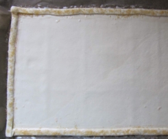 Den Blätterteig (bei mir 39 x 25 cm) auf das Backblech legen und den Rand ca. 1 cm nach innen schlagen. Es bleibt eine Größe von 37 x 23 cm. Den Rand mit den 1-2 EL Kaffeesahne bestreichen und mit dem Zucker bestreuen.