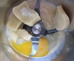 Die Marzipanrohmasse in Stücken, die 20 g Kaffeesahne und das Ei in den