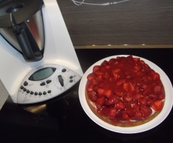 "Mixtopf geschlossen" mixtopf geben, 100 ° - 6 min - Stufe IIMixtopf abkühlen lassen, Kuchenform aus dem Ofen holen, abkühlen lassen.. solange weiter um die Erdbeeren kümmern und diese durchrühren..