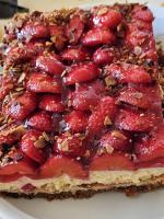 Rühraufsatz einsetzen. Paradiescremepulver mit der Sahne in den Mixtopf geben, 30 Sek./Stufe 3 verrühren. Den Schmand zugeben, 15 Sek. /Stufe 3. Auf dem abgekühlten Boden verteilen. - Erdbeeren waschen, entstielen und abtropfen lassen. Halbieren und auf der Creme verteilen.
