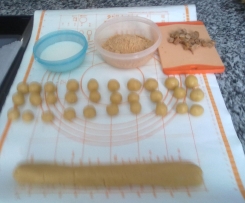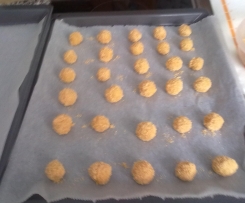 Kugeln in der Milch wenden, in den zerkleinerten Erdnüssen wälzen, mit Abstand auf die vorbereiteten Bleche geben und bei 160° - 180° (je nach Ofen) 18 Minuten backen.