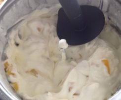 Dann habe ich den Schmand dazu getan und die kleingeschnittenen Pfirsiche.. das ganze auf Stufe 4 Linkslauf eine Minute, danach hatte ich nur noch Matsche in meinem Thermomix.