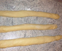 Teig in 3 Teile teilen.Mit sehr wenig Mehl mindestens 3 Röllchen zubereiten.Dabei beachten den Teig nicht zu sehr zu ziehen,denn dann reißt er.Einfach zwischen durch etwas ruhen lassen und weiter in die gewünschte Länge bringen.