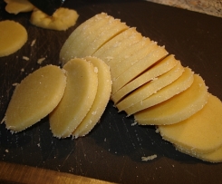 Auf ein mit Backpapier ausgelegtes Blech legen und bei 175° Umluft goldgelb backen,