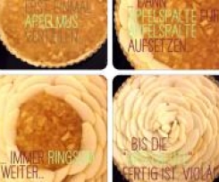 Apfelspalten jetzt wie folgt auf der Tarte verteilen: außen beginnend immer ringsum überlappend legen, quasi "eine Schnecke" aus Apfelspalten von außen nach innen legen.. So wie auf den Bildern:Mit dem Zucker bestreuen.