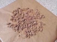 "Sanftrührstufe" rühren. - Nun sollten die Mandeln komplett mit dem Zucker überzogen sein und man kann sie auf ein Backblech mit Backpapier verteilen.