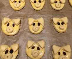 Ein Ei verquirrlen, die Ovale damit einstreichen und die eingeschnittenen Ecken nach unten klappen. Rosinen als Augen draufsetzen.