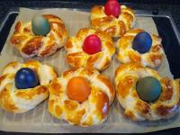 Die Nester auf dem Backblech (mit Backpapier ausgelegt) mit Eigelb bestreichen und nochmals 10 Minuten gehen lassen.