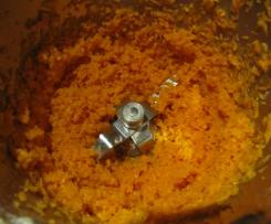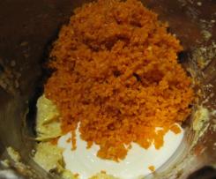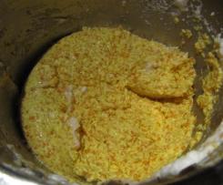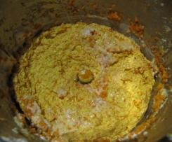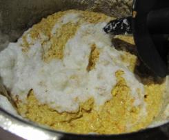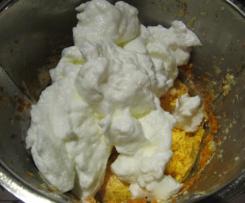 "Mixtopf geschlossen" auf St. 3 rühren lassen und die Eigelbe mit Salz und Zitronenschale nach und nach durch die Deckelöffnung zugeben. - Joghurt und die zerkleinerten Möhren hinzufügen ....