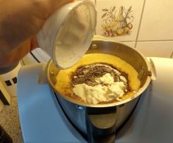 - Vermische die trockenen Zutaten in einer separaten Schüssel und gib diese zusammen mit dem Joghurt in den Thermomix. Lasse den Thermomix 2 Min./Stufe 4 laufen und Füge die Zutaten durch die Deckelöffnung hinzu.