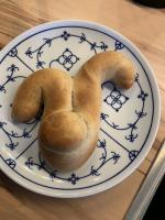 5. Anschließend Teig in ca. 6 bis 8 Portionen teilen und jeweils zu ca. 25-30 cm langen Strängen rollen. Vom Teigstrang eine kl. Portion für das Schwänzchen zur Seite legen. Teigstrang U- förmig legen und das offene Ende verdreht (2x) übereinander legen. Nun das Schwänzchen zu einer kl. Kugel formen und unten in das entstandene "Loch" legen. Fertig!