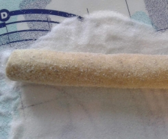 Aus dem Teig vier bis 5 Rollen mit einem Durchmesser von einem 2-Eurostück formen, sorgfältig in Zucker wälzen, sodass eine dicke Zuckerschicht entsteht, in Folie wickeln und ungefähr 30 Minuten zum Festwerden in den Kühlschrank stellen