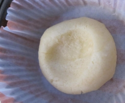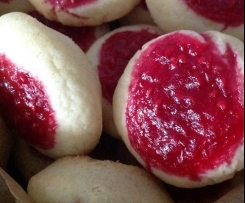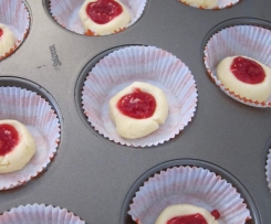 Diese Stücke zu Kugeln formen (Hände bemehlen) und in eine Minimuffin(Silikon)form geben oder in Muffinpapierförmchen geben. In jede Kugel eine Vertiefung drücken und ein Klecks Himbeermarmelade geben.