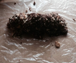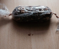 Den Teig in der Tüte aufrollen und die Enden fest zusammendrehen!So dass der Teig fest zusammengepresst wird! Sieht aus wie eine Salami!!!