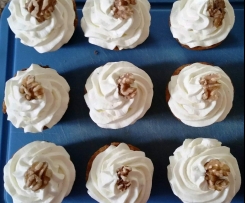 Danach die Masse in einen Spritzbeutel geben und auf die abgekühlten Cupcakes spritzen und mit Walnüssen ganieren