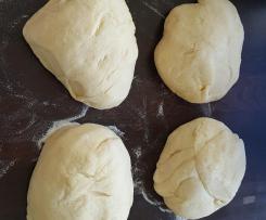 Den Teig aus dem Topf nehmen, in eine geölte Schüssel umfüllen und ca. 40 Minuten gehen lassen. - Den Teig in gleichmäßige Kugeln einteilen und zur Seite legen.
