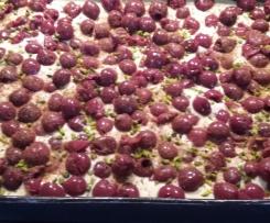 Die Creme direkt auf den vorbereiteten Quark-Öl-Teig in der Backform geben und mit den abgetropften Sauerkirschen belegen. Wer mag mit noch etwas Zimt und gehackten Pistazien bestreuen.