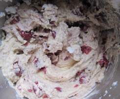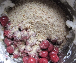 Die Kirschen (oder den Rhabarber) und gemahlene Mandeln hinzufügen ....