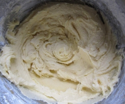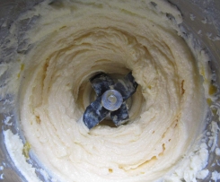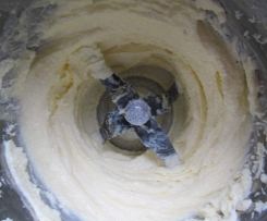 Die Masse auf St. 4 laufen lassen und währenddessen die Eigelbe durch die Deckelöffnung nach und nach zugeben. Mit dem Spatel vom Rand nach unten schieben.
