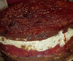 Diese Masse auf den Kirschbelag geben, zweiter Tortenboden obendrauf - Wer möchte streicht den Deckel nun mit Kirschkonfitüre ein.
