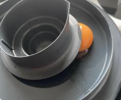 - Die Eier einzeln aufschlagen und vorsichtig auf den lose verschlossenen Deckel gleiten lassen, so dass das Eiweiß in den Mixtopf fließen kann. Das Eigelb dann vom Deckel in eine Schale gleiten lassen.