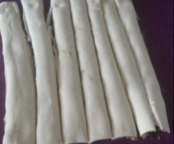 Anschließend ca. 1,5cm breite Bahnen schneiden das geht am besten mit einem Pizzarad und diese dann einrollen zu kleinen Schnecken