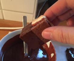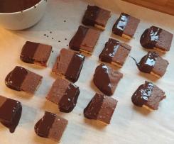 die Vierecke zur Hälfte ich die flüssige Schoko Glasur tunken und auf Backpapier trocknen lassen. - Ich schneide den Rand direkt ganz schmal ab- die Randstücke bleiben sonst immer übrig
