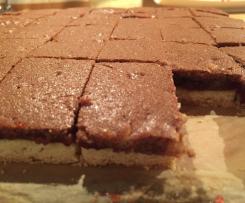 Die Schoko Masse als dritte Schicht mit einem Teigschaber vorsichtig auf der Marmelade verteilen.
