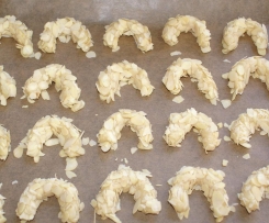 Die Marzipanmasse dann in den Mandeln wälzen und in der typischen Hörnchen-Form auf ein mit Backpapier ausgelegtes Backblech setzen (die Masse reicht für zwei Bleche).