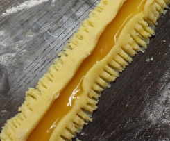 Einen etwa 5-6cm-breiten Streifen ausrollen und in der Mitte mit Marmelade bestreichen. Die Ränder hochklappen und mit einer Gabel andrücken.