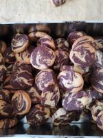 Die Teige leicht miteinander verkneten, damit sie marmoriert sind. - Aus dem Teig Rollen formen (ca. 3 cm Durchmesser), in Frischhaltefolie wickeln und circa 1 Stunde ins Gefrierfach legen.