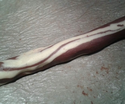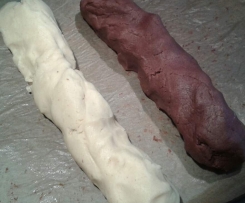 Die Teige leicht miteinander verkneten, damit sie marmoriert sind. - Aus dem Teig Rollen formen (ca. 3 cm Durchmesser), in Frischhaltefolie wickeln und circa 1 Stunde ins Gefrierfach legen.