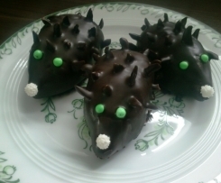 Mandelstifte hinein stecken und die Igel in geschmolzene Kuvertüre tauchen.