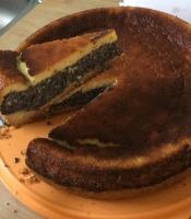 4. Zum Schluss die Mohnmasse in die Springform füllen und glattstreichen. Den Guß am besten über einen Löffelrücken langsam über die Füllung laufen lassen. Den Kuchen bei 180° Umluft ohne Vorheizen in den Backofen geben. Zweite Schiene von unten. Backzeit ca. 60 Minuten.