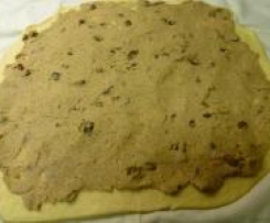 Den gegangenen Hefeteig auf einem bemehltem Teigtuch ausrollen, mit der Fülle bestreichen und aufrollen-