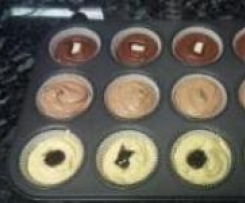 Kakao und Milch in den dritten Teig geben und glatt rühren. Wie zuvor in die letzten vier Förmchen verteilen, und jeweils ein Stückchen Bounty in den Teig drücken.
