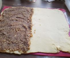 Nüsse, Zucker und süße Sahne in einer Schüssel von Hand verrühren. - Teig ausrollen.