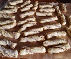 - Teig zusammenklappen, in ca. 1,5 cm breite Streifen schneiden, teilen und zu Stängchen verdrehen.