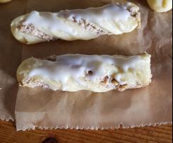 - Puderzucker mit Wasser zu einer dickflüssigen Glasur verrühren und Stängchen bestreichen.